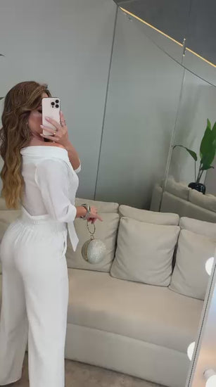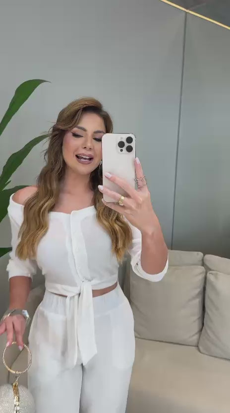A camisa cropped possui amarração frontal, mangas longas e decote ombro a ombro que valoriza o colo com feminilidade. Já a calça pantalona entrega caimento impecável, cintura alta e muito conforto, alongando a silhueta e deixando o look ainda mais refinado.