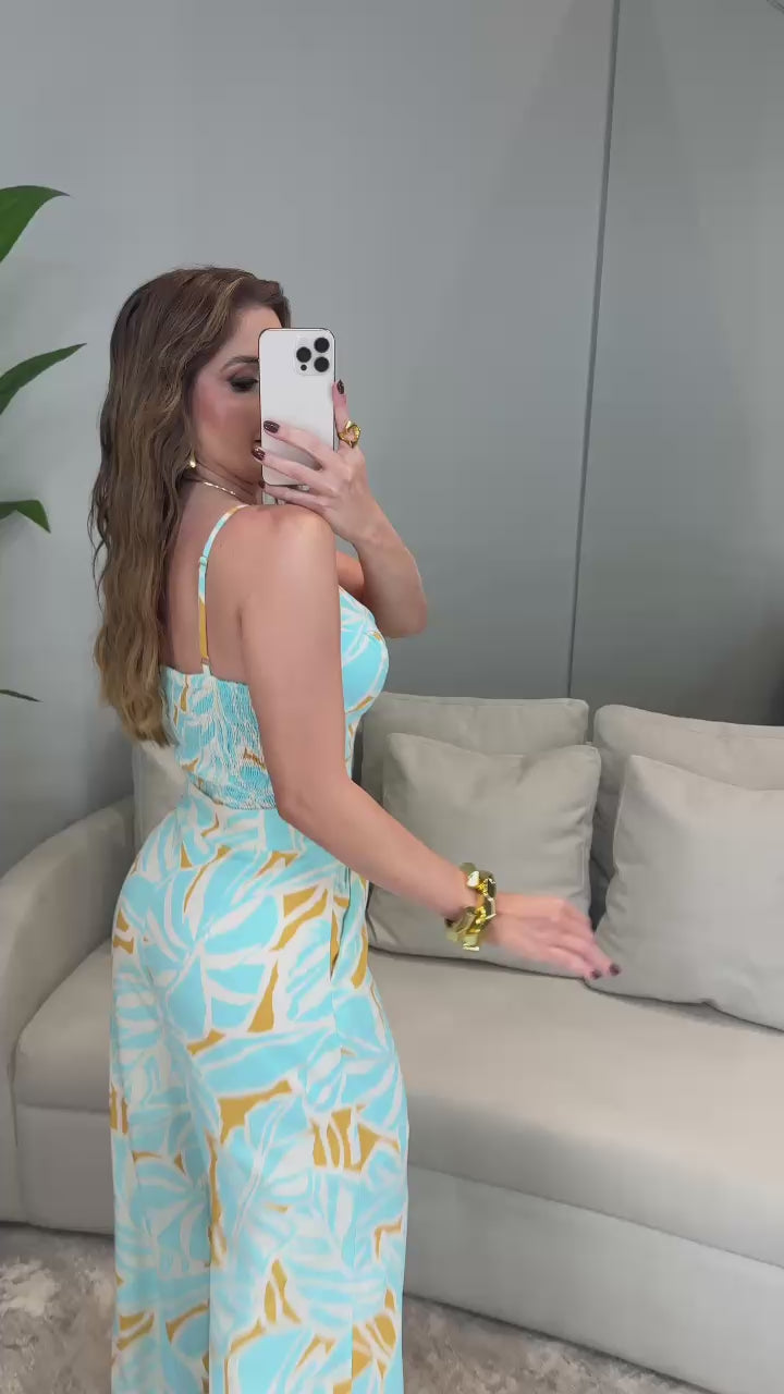 Conforto, frescor e muito estilo em um só look! Este conjunto é composto por cropped com alcinhas finas e calça pantalona em viscolinho, com estampa tropical em tons de azul e mostarda. O detalhe em cordão na cintura traz um toque descontraído e ajusta o caimento com charme.