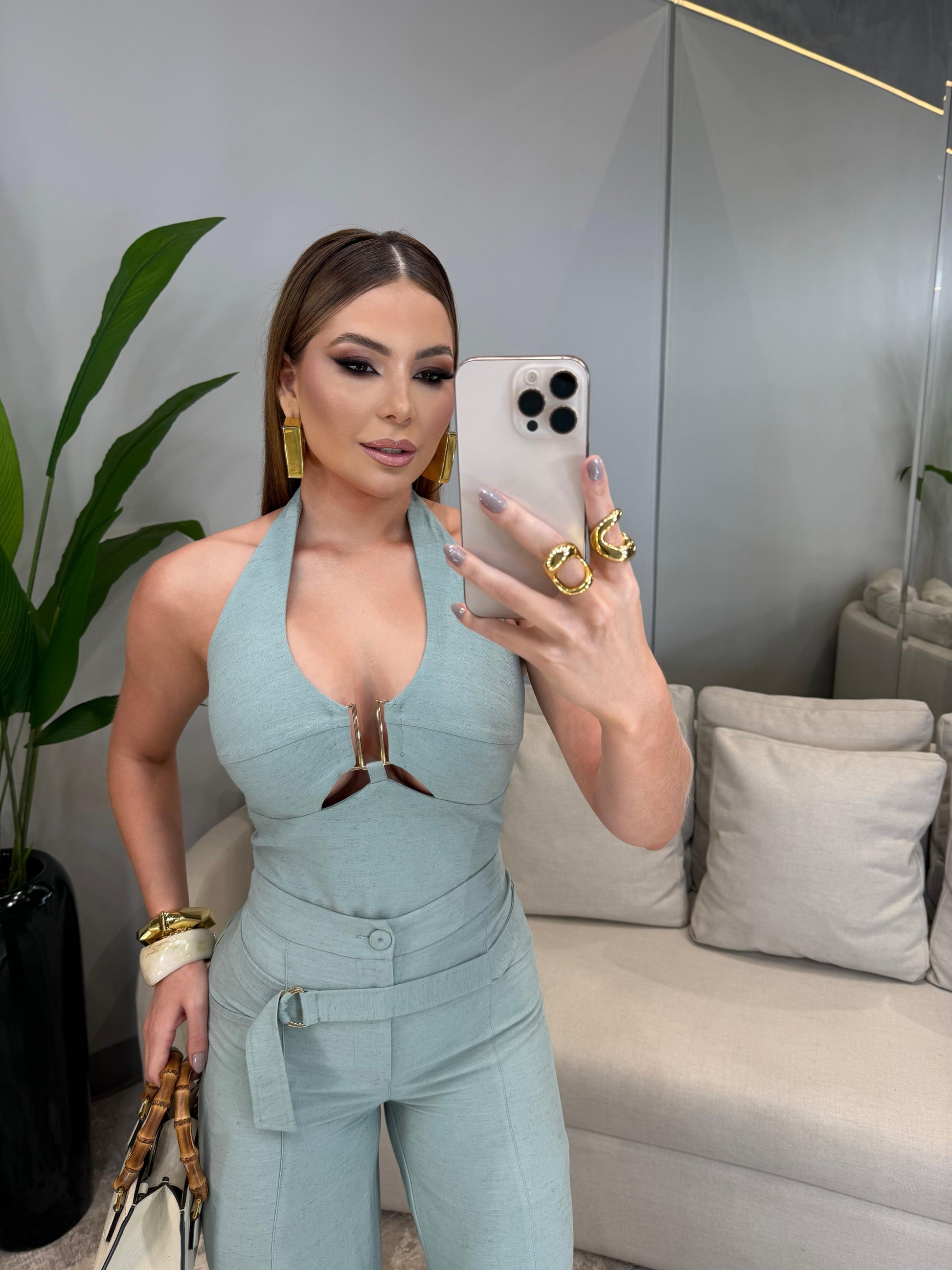 Esse conjunto em alfaiataria traz um visual elegante e moderno para mulheres que querem se destacar com sofisticação. O top com decote halter e recorte frontal em detalhe metálico valoriza o colo, enquanto a calça de cintura alta com cinto embutido e fendas frontais alonga a silhueta e traz movimento.