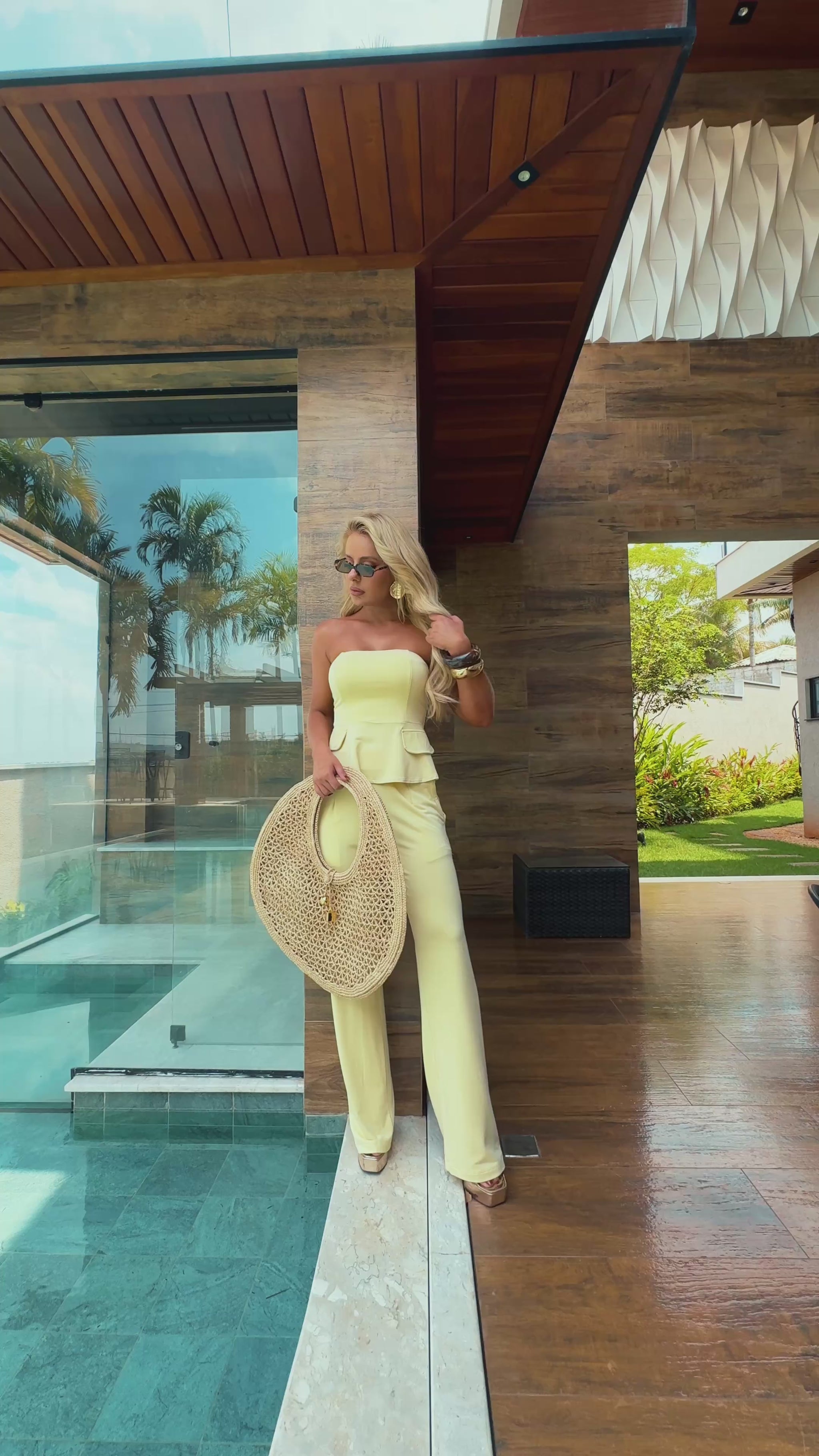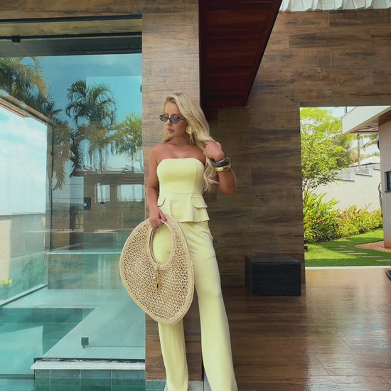 Conjunto em moletinho na delicada cor amarelo manteiga, composto por top tomara que caia estruturado com detalhe peplum e recortes que valorizam a silhueta. Acompanha calça de cintura alta com modelagem reta, oferecendo conforto e sofisticação em uma só peça. Um look leve, fresh e elegante — ideal para dias ensolarados ou produções mais refinadas. Disponível nos tamanhos P, M e G.