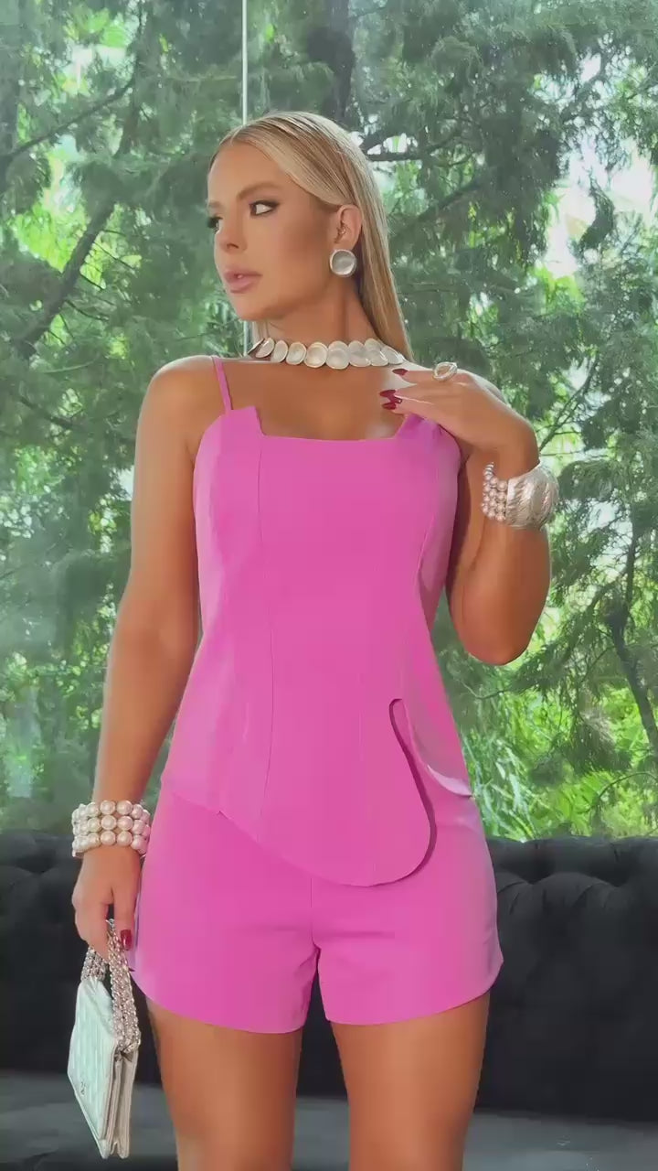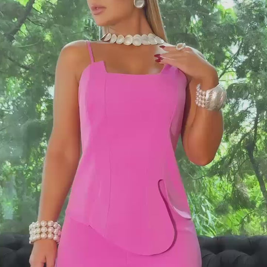 Macaquito cheio de estilo alinhado às tendências atuais com blusa corset de alças finas e caimento estruturado, que valoriza muito bem a silhueta. O detalhe assimétrico na barra dá um toque arquitetônico e contemporâneo ao visual.