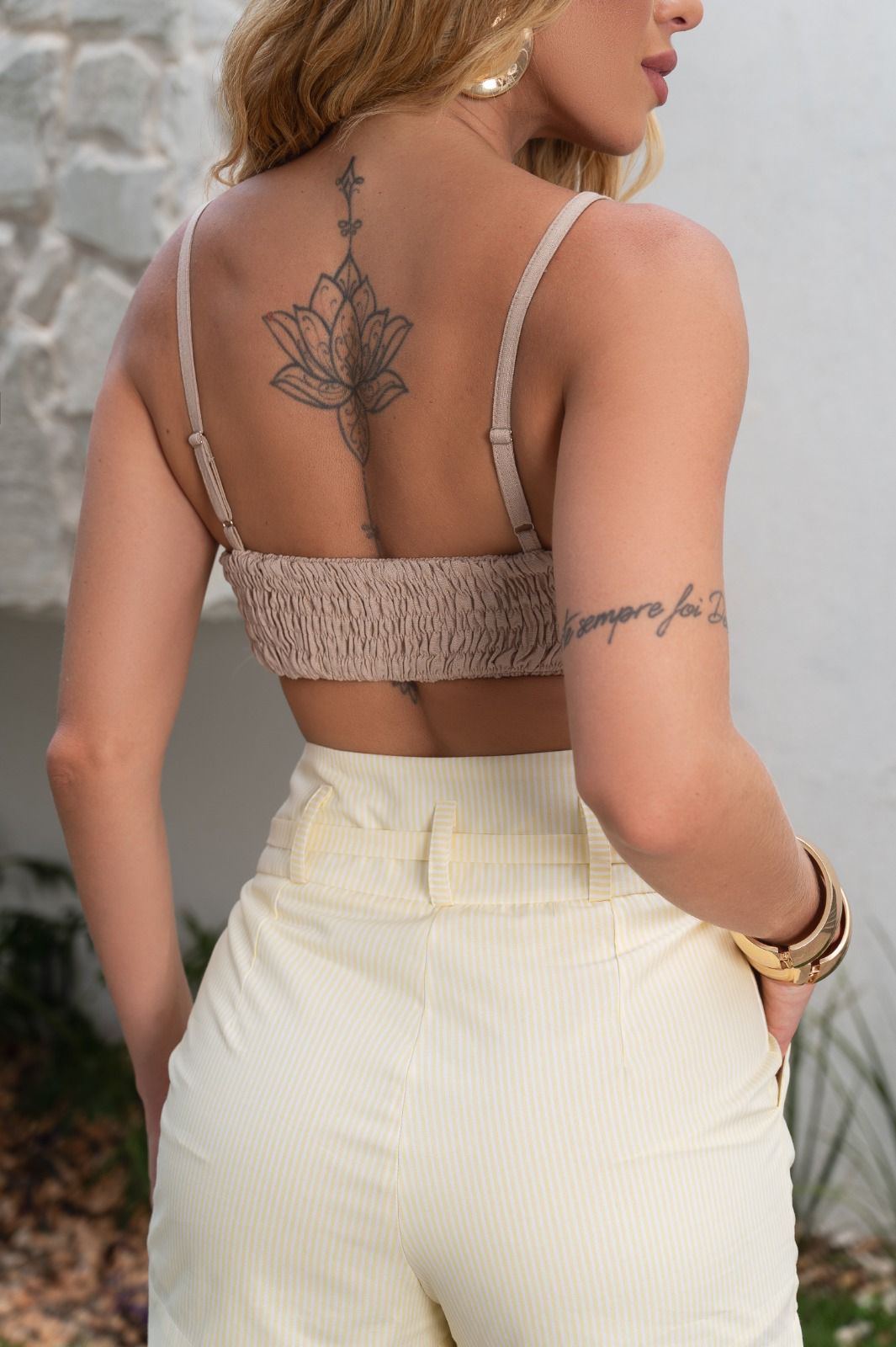 Possui cintura alta, detalhe de recorte em “V” no cós e cinto embutido com fivela dourada, trazendo um toque de elegância e modernidade.