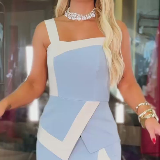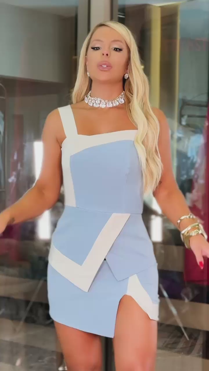 O destaque fica por conta da modelagem assimétrica, presente tanto na alça única quanto nos recortes frontais, que trazem personalidade e elegância ao look. O jogo de cores claras cria um visual atual e refinado.