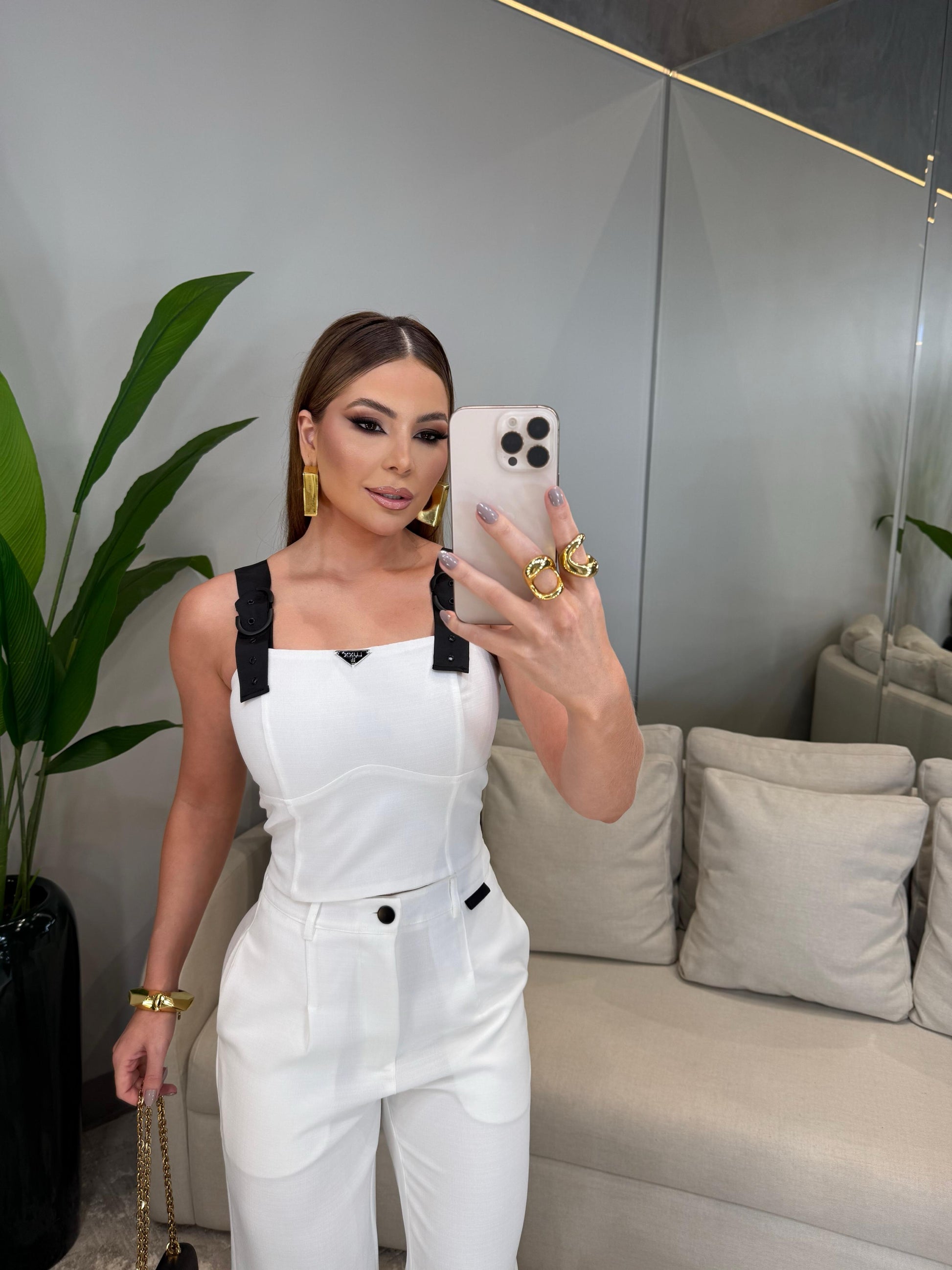 Possui também *bolsos laterais com detalhe de puxador e recortes estratégicos*, que reforçam o estilo urbano-chique. Ideal para produções fashionistas em dias quentes ou eventos casuais com toque de sofisticação. A composição com acessórios metalizados e bolsa branca finaliza o look com perfeição.