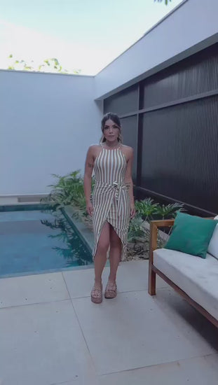 Vestido na malha viscolaycra midi listrado com amarração na cintura e fenda. Moderno e despojado