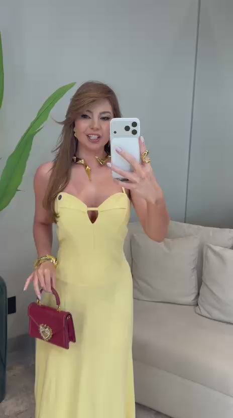 O modelo conta com alças finas ajustáveis e costas abertas com amarração, trazendo charme e delicadeza ao visual. O tom amarelo iluminado valoriza qualquer ocasião — do pôr do sol à beira-mar a festas ao ar livre. Disponível nos tamanhos P, M, G