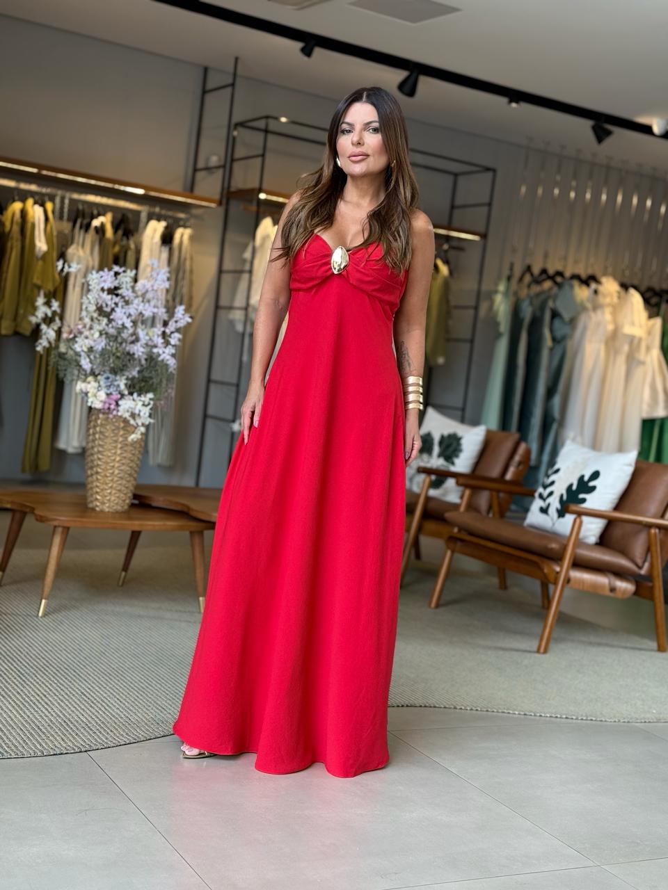 Vestido vermelho superfluído, com caimento leve e movimento elegante. Possui alças removíveis, podendo ser usado como tomara que caia para um visual ainda mais sofisticado. Destaque para a fivela frontal que adiciona charme moderno à peça. Com bojo para maior sustentação e conforto, é um modelo atemporal, ideal para ocasiões especiais ou produções estilosas do dia a dia.