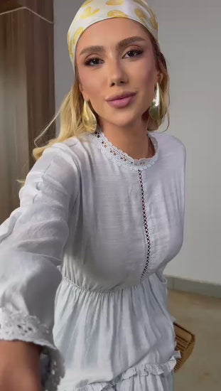 Modelo curto em viscolinho, com modelagem soltinha, mangas longas e detalhes delicados que trazem aquele toque romântico e sofisticado ao look.